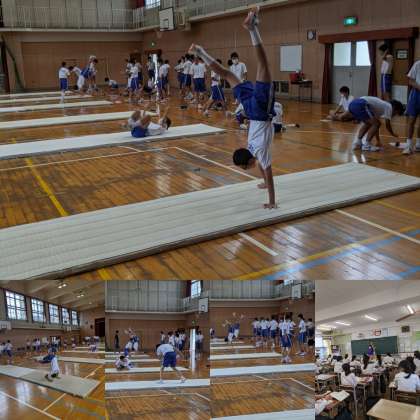 【体育】男子はウォーミングアップ後倒立歩行をしていました。女子は喫煙についての内容でした。(1、2組)