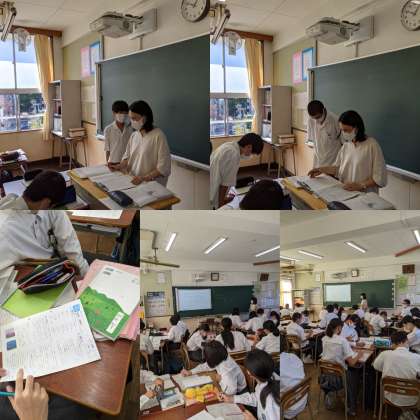 【国語】徒然草の暗唱テストをしています。待っている生徒はプリントをしていました。(2組)