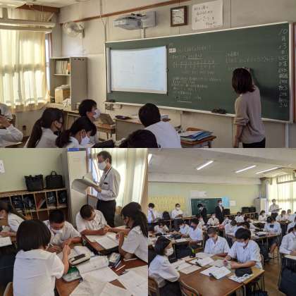 今年度、八阪中学校では『主体的・対話的で深い学び』の推進授業をおこなっています。1時間目に2年4組の数学の授業でおこないました。班にわかれての授業で、相談できる環境でおこなっていました。授業内容は1次関数のグラフの書き方についてです。教育委員会の人や多くの先生に囲まれての授業はかなり緊張したのではないでしょうか。その中でしっかり発言できていました。