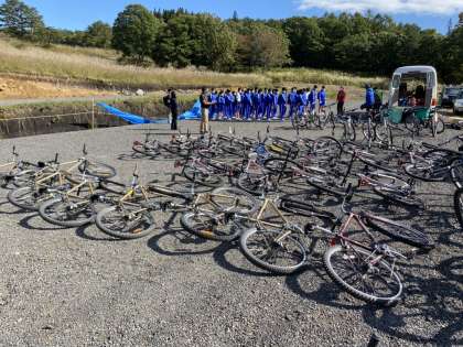 選択別体験のマウンテンバイクチームはインストラクターさんの講習をしっかり受けてからのスタートです。本格的なスポーツとして普段とは違う自転車を楽しみます!