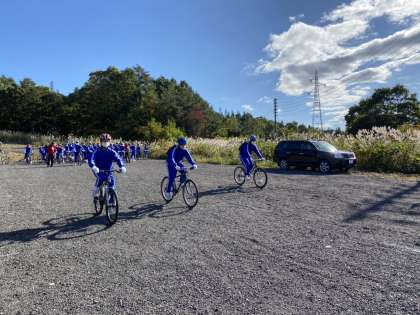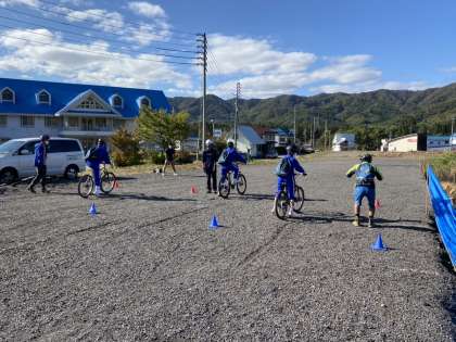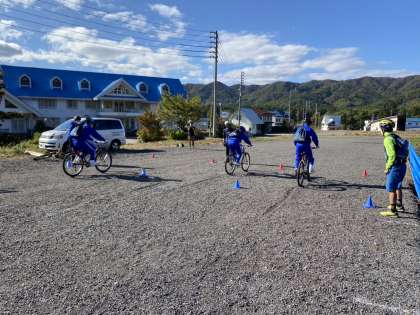 続いてはスピードを上げてペダルを水平にして立ち上がり、腰を後輪まで下げて素早く止まる練習です。赤いコーンの先は崖で青色のコーンより前でブレーキしちゃダメ!