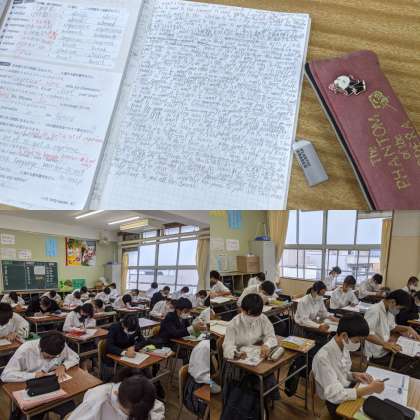 【英語】問題集・プリントなどをしていました。英単語を覚えるため、ノートにびっしり単語が書かれていました。(3組)