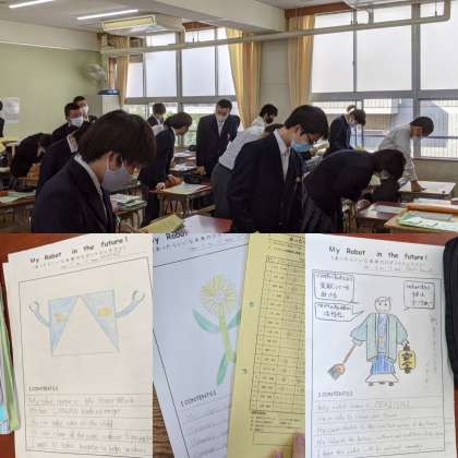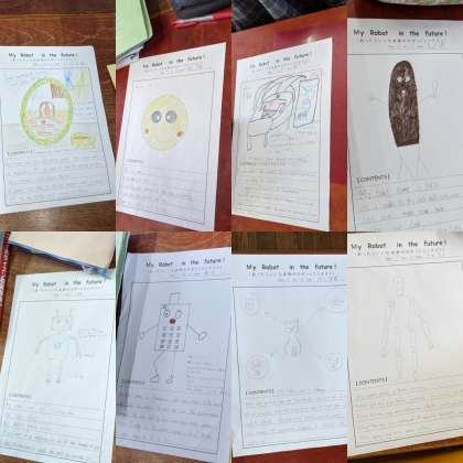 【英語】『あったらいいな未来のロボットコンテスト』というタイトルでそれぞれが考えたロボットを英語で説明しています。友達の作品を見て評価しています。(4組)