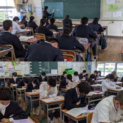 1時間目の授業の様子です。3年生は、昨日の実力テストが返却されていました。各教科担当から問題の解説がされていました。数学で出題された規則性の問題は閃きの問題ですね。頭を柔らかくしないと中々出てきません。解き方は色々あると思うので自分の解き方を見つけてください。実力テストは、入試当日にどれだけ点数がとれるかの判断材料になります。進路懇談でも大事な材料になるのでしっかりがんばってください。次の実力テストまで1ヶ月を切ってます。