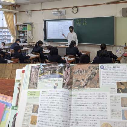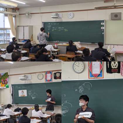 【英語】単語の発音の確認をしていました。黒板には『発音クン』が描かれています。いつも発音の仕方を教えてくれます。(3組)