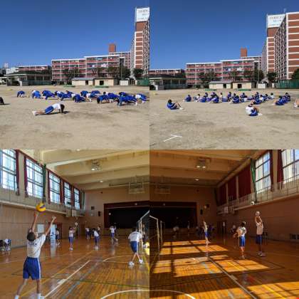 【体育】男子はバレーボールのトスの練習をしています。ずっと上を向いているので首が疲れそうでした。女子は競技に入る前のトレーニングの様子です。今日から後期体育委員が仕切っていきます。成長していく姿を見るのが楽しみです。(3,4組)