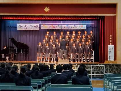 「全力合唱 〜歌で心を通い合わせて〜」をスローガンに約2か月間、毎日練習を積み重ねました。パートリーダーが練習方法を工夫し、全員で協力し、本番を迎えました。