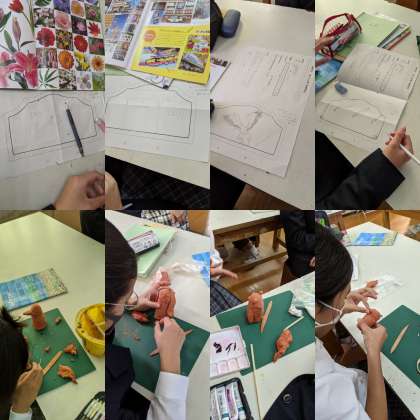 【美術】置き物を作っています。完成した生徒は次の課題のキーハンガーの下書きをしています。(2組)