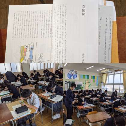 【国語】『玄関扉』という題材です。『内開き』『外開き』『引き戸』文化の違いで考え方が変わります。(3組)