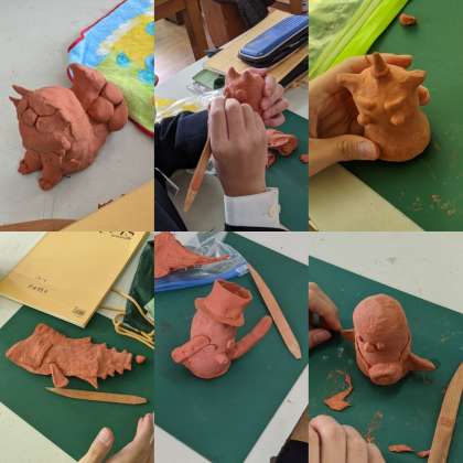 【美術】置き物を作っています。色々な形があり平たい置き物もありました。(4組)