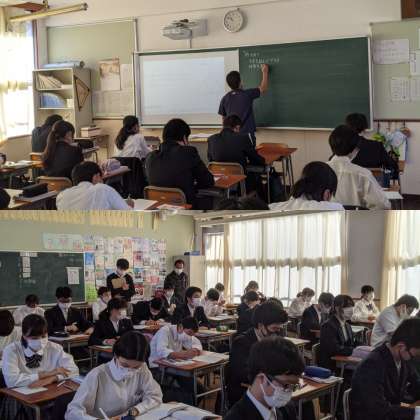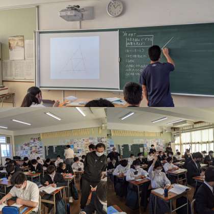 3時間目に3年2組で数学の研究授業がおこなわれました。中点連結定理の内容です。