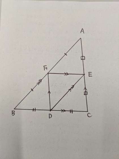 まず、三角形の辺の中点を結んでできる図形についてどのような性質があるのかを考えます。全ての辺が1:1に分けられているので、AC//FD、AB//ED、BC//FEとなるため中に出来る四角形は平行四辺形になります。ゆえに中に出来る三角形は全て合同です。この後に中点連結定理について学びました。