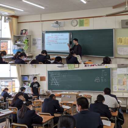 【理科】『平均の速さ』『瞬間の速さ』のプリントで、単位をしっかり確認して解いていくようにと説明がありました。(2組)