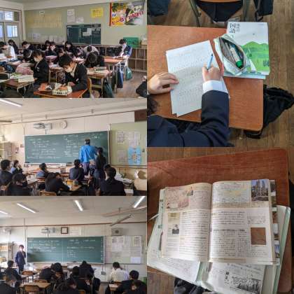 【社会】プリントの答えの確認をしています。生徒たちが黒板に答えを書きにいきます。天保の改革なので、江戸時代も後半に入ってきます。(3組)
