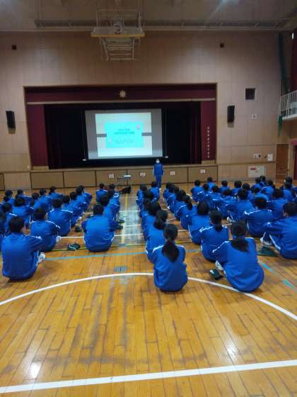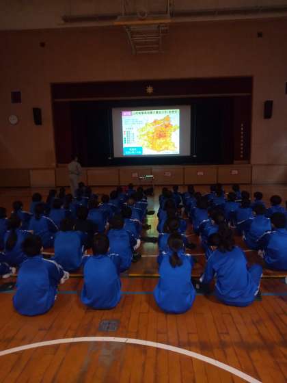 体育館では防災講話です。阪神淡路大震災、東日本大震災の想像を絶する被害状況また