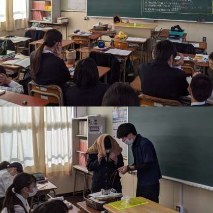 【理科】静電気を放電させて音を鳴らします。かなり大きな音が鳴るため、実験をする生徒はひざ掛けをかぶって耳をふさぎます。見ている生徒も距離をとって警戒しながらの観察です。(1組)