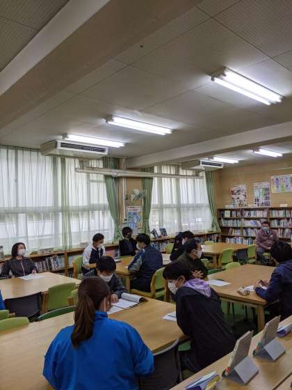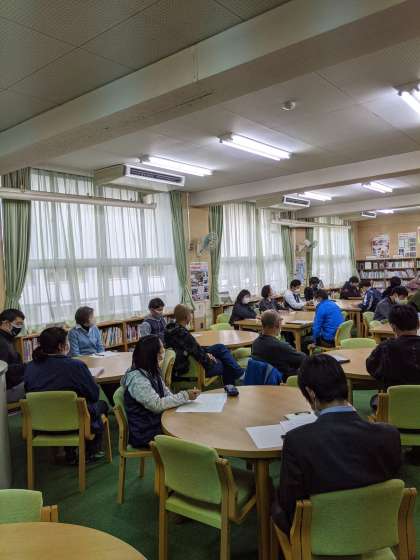 6時間目の研究授業の後、図書室で研究協議がおこなわれました。生徒たちがより授業に興味関心を持てるような『主体的・対話的で深い学び』の授業が展開できるように話し合います。