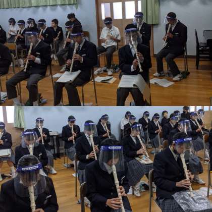 【音楽】リコーダーの練習です。ドレミファソの音をみんなで確認しています。(1組)