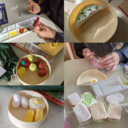 【美術】お弁当作りです。どんどんリアルな作品ができあがっていきます。(4組)