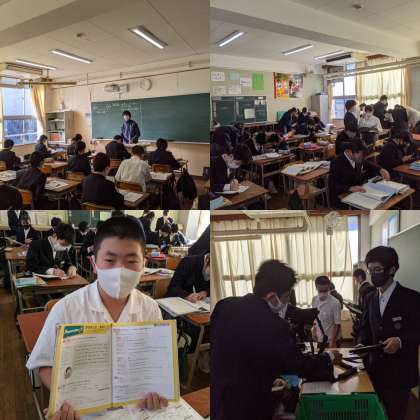 【英語】スピーキングをしてわからない所は宿題です。タブレットを活用して調べます。3学期の発表の準備をしている人もいます。(2組)