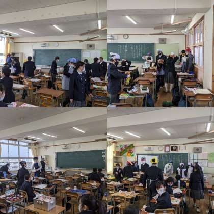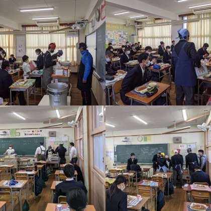 4時間目が終わった後、手洗いをしてからみんなで協力して給食の準備をします。もちろんエプロン、三角巾を着けて配膳します。