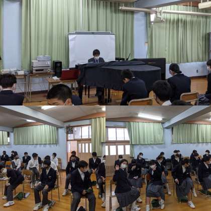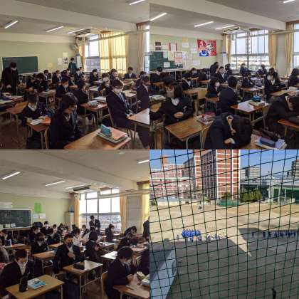 授業が始まる2、3分前になると、どのクラスも授業の準備をしてチャイムが鳴るのを座って待ちます。先生も教卓の前で生徒たちの様子を見ます。グランドでは準備運動のランニングが始まっています。音楽室では音楽の先生の演奏でクリスマスソングが流れていました。始業のチャイムと同時に挨拶をして授業が始まります。『50分間授業がきっちりおこなえる』この毎日の積み重ねが生徒たちの力になっています。時間を大事にする姿勢を継続していって欲しいです。