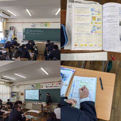 【理科】エネルギーについて学んでいます。火力発電、原子力発電など技術の授業でも調べていましたね。(4組)