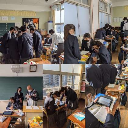 【英語】福島区の町紹介を英文で考えています。タブレットを使ってみんなで相談しながら作りあげます。(1組)