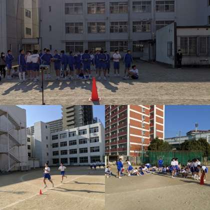 【体育】男子は1500m女子は1000mを走ります。みんな一生懸命走ります。応援の声もグランドに響きます。(3、4組)