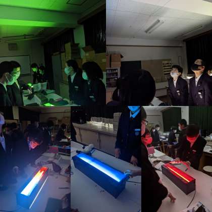 【理科】光の実験です。光の3原色について学んでいます。緑・赤・青の3色を重ねて色を作ります。3色が重なると何色になったのでしょうか。天井にうつった色を見ます。(1組)