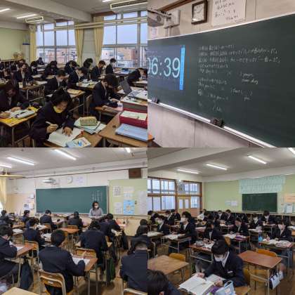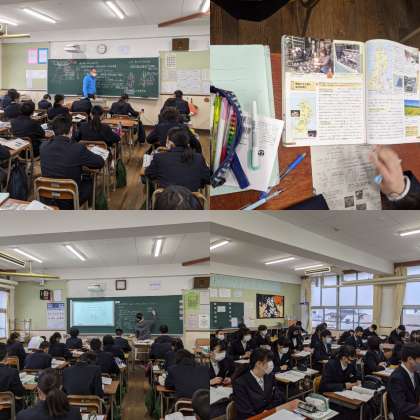 【社会】東北地方について学んでいます。先生のテンポの良い説明を聞きながら、要点をプリントに書き込んでいきます。(2組)