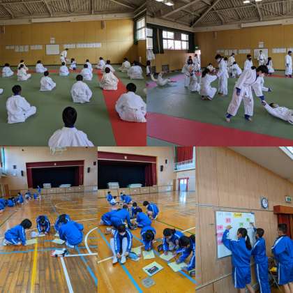 【体育】柔道の授業で、受け身をしています。(2組)ダンスの授業で、グループで、振り付け・ステップ・立ち位置などを創作します。(1組)