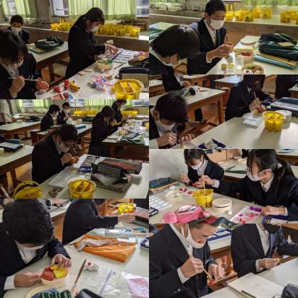 【美術】絵具で色を付けた後、ニスを塗ります。弁当の中身が仕上がった生徒は、ふたのデザインをします。(4組)