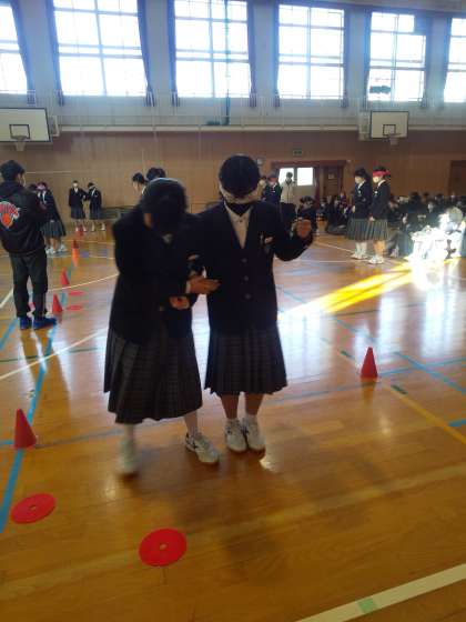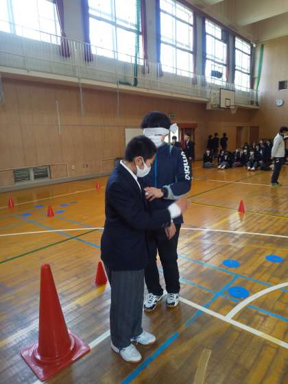 本校1年では、先週「福祉」について考える学習をしました。木曜日には体育館で、学年主任の先生が町で体験した、視覚に障がいを持つ人との出会いについてのお話を聞いた後、2人1組で目をタオルなどで覆って館内のコースを通るという体験活動をしました。あくまでも疑似体験ですが、視覚に障がいを持っている方の思いや、サポートする人の思いに少しだけ触れることができました。また、金曜日には各教室でDVDの「しんちゃんが泣いた」を鑑賞しました。この学習を通して、「人と関わること」の大切さ、そのために「人を理解すること」の大切さを学びました。バリアフリーの行き届いた、みんなが暮らしやすい社会の実現のため私たちは何が出来るのでしょうか。Let’s think !