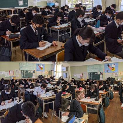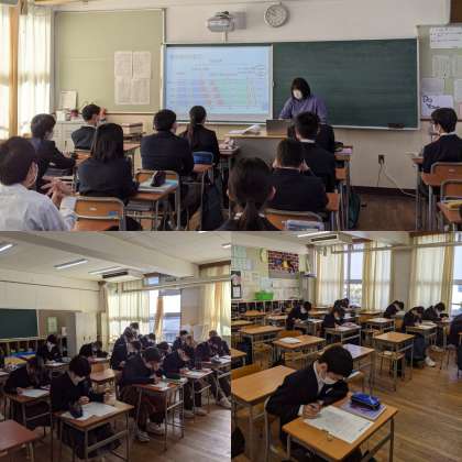 【国語・技術】明日の入試に向けて勉強をしています。それぞれの高校の赤本をしていました。(4・1組)