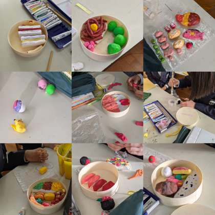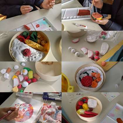 【美術】お弁当づくりです。色も付いて、おいしそうに仕上がってきています。ふたのデザインも考えています。(3組)