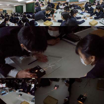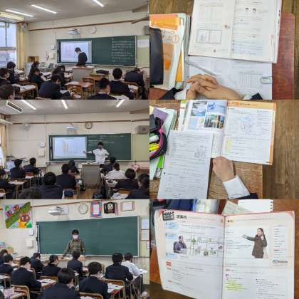 【社会】資源について学んでいます。『太陽光』『風』『地熱』を利用したものを『再生可能エネルギー』といいます。(2組)