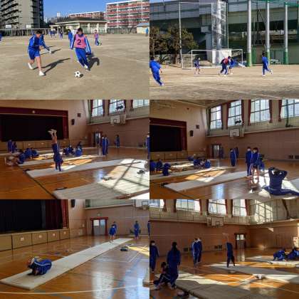 【体育】男子はサッカーで3つのコートに分かれて試合をしています。女子はマット運動で、次の時間の発表に向けて練習をしています。(3・4組)