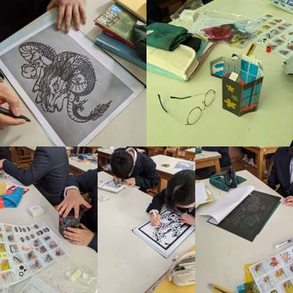 【美術】ステンドグラスと切り絵をしています。(3組)