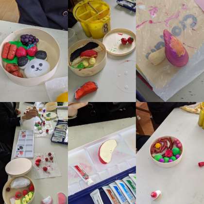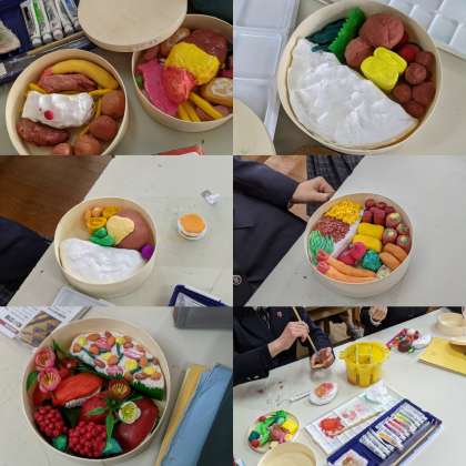 【美術】弁当作りの作品です。とてもリアルに仕上がってきています。色も丁寧につけておいしそうです。(3組)