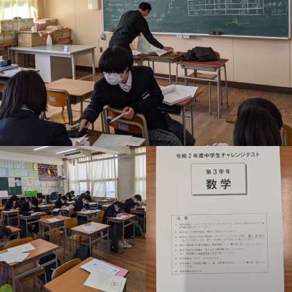 【数学】分割で授業をおこなっています。チャレンジテストと資料の活用をしています。平均値・中央値・最頻値が何か確認しましょう。(3組)