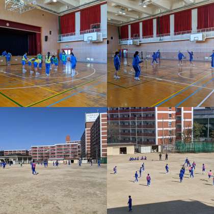 【体育】男子は運動場一面を使ってサッカーの試合をしています。女子はバドミントンとバスケットボールをしています。(1・2組)