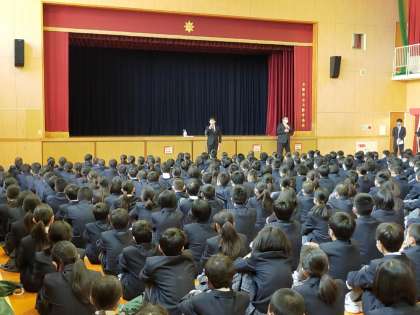 生徒指導主事の小松先生より、八阪中学校で学ぶ心構えや姿勢について、お話かありました。
