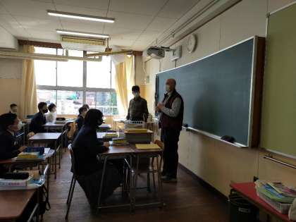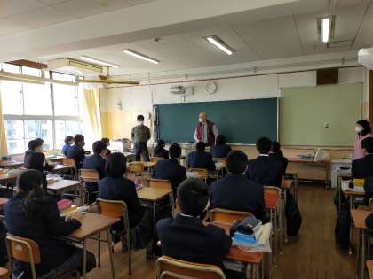 写真は1時間目の2年生の英語の授業の様子です。早速、八阪中学校の生徒に授業をしてくださいました。