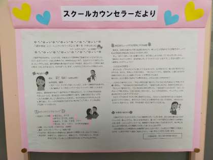 写真の「スクールカウンセラーだより第1号」には、「友達のこと、勉強のこと、家族のこと、自分自身のこと、その他……、あなたが困っていることであれば、どんなことでも大丈夫ですよ。」とあります。誰かに話すことで気が楽になることもあるかもしれません。皆さんの保護者の方や友達、先生もその一人かもしれません。そういった「誰か」の中に、スクールカウンセラーの先生もいます。