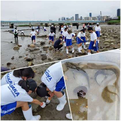 本校の生徒と築港中学校の生徒、さらに大阪高校の学生も加わり、ひたすら石垣を作製していきました。途中、カニやウナギも捕まえながら、みんな泥まみれになりながらワイワイと活動を楽しんでいました。