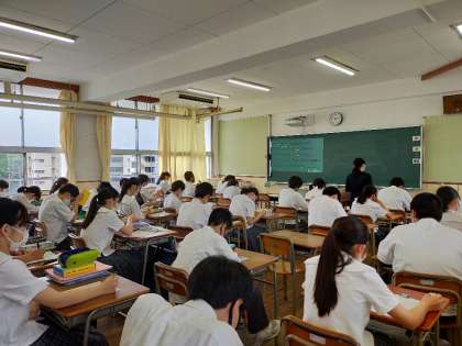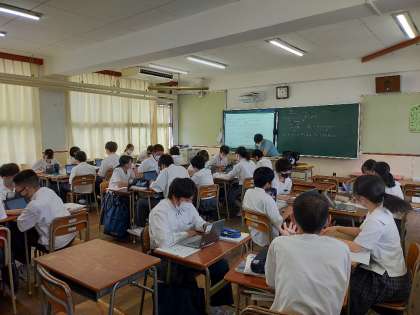 2年1組の理科の授業、2年2組の英語科の授業の様子です。
