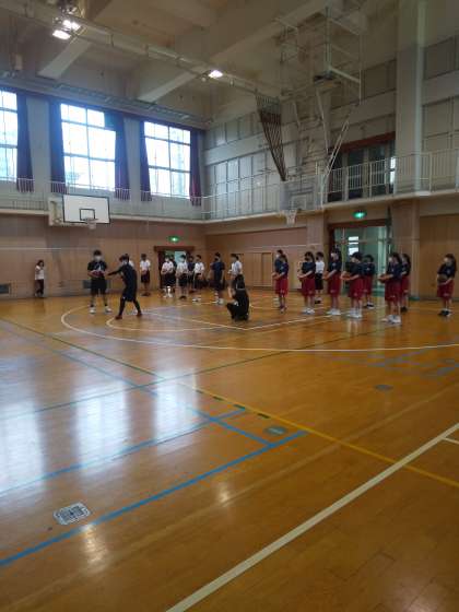 続いて澤井コーチによるバスケットボール部員への技術指導がありました。「焦らずに土台を使って」「楽しんで」等、温かな言葉を頂きながら指導してくださいました。