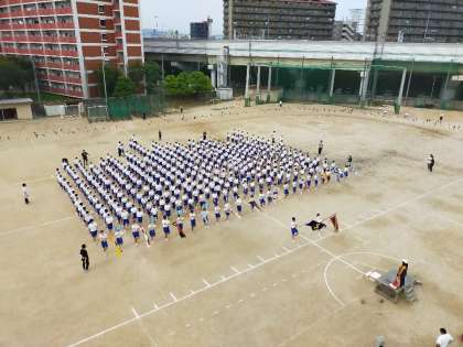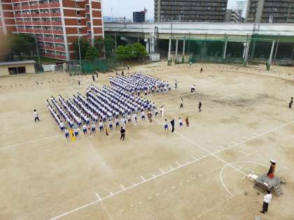 体育科の梁先生の指揮により、クラスごとの入場行進を行い、その後全校生徒列を合わせて行進します。