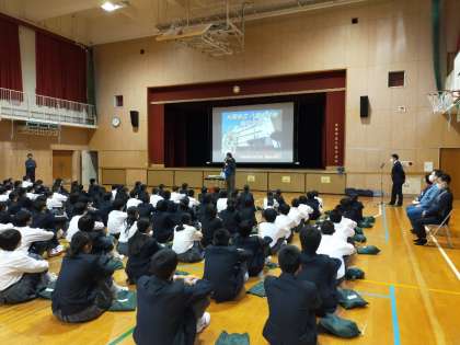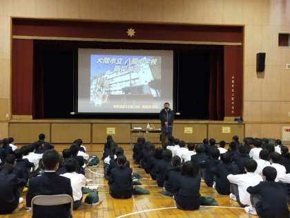 本日6限目、1年生は体育館にて防災学習に取り組んでいます。